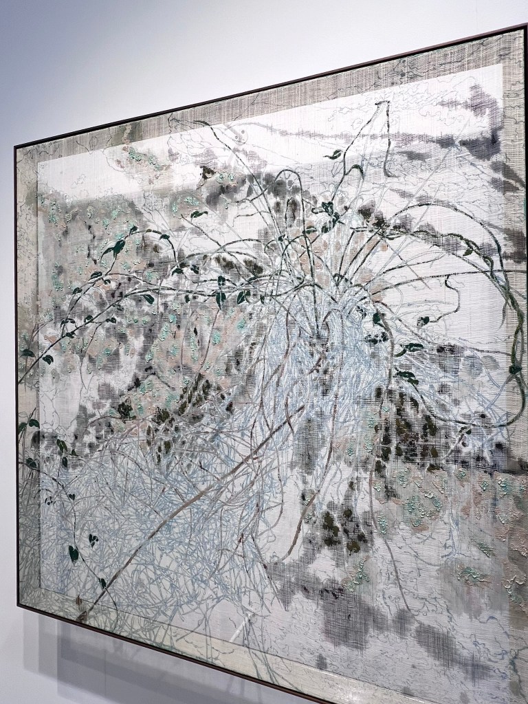 當代藝術家吳觀真,詮釋自然景物有別於其他藝術家表現的材質與形式,以大漆、苧麻、銀箔來展現對於過往記憶和情感的流露。無論是近看或遠看,能感受到藝術家的情感對於大自然和光影之間獨出心裁的細緻呈現。