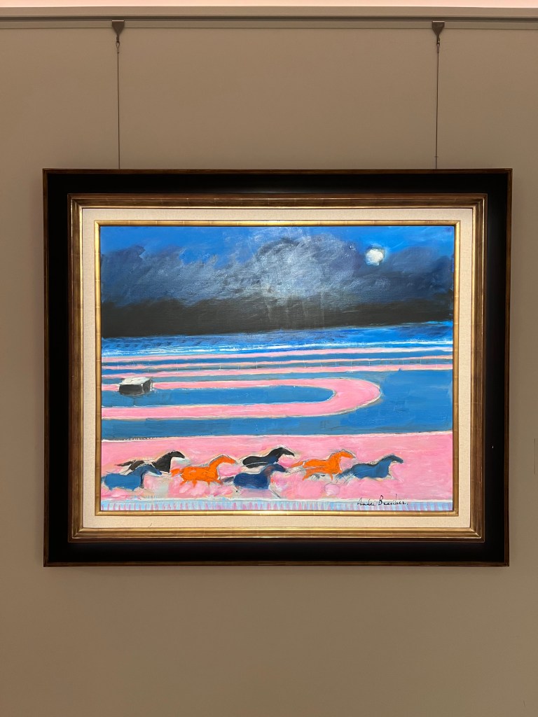 生於1929法國藝術家André Brasilier,畫作常見田園風光、馬匹、大海,以詩意筆觸勾勒鮮明的主題,描繪夜色奔馳的馬群,展現夢幻、自由與生命活力。