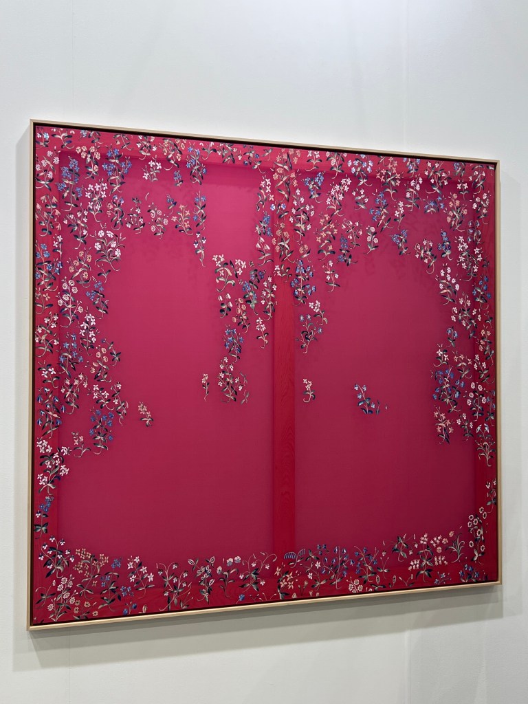 來自馬德里畫廊NF/NIEVES FERNÁNDEZ,西班牙當代藝術家Clara Sánchez Sala 創作語彙透過裝置、繪畫、織物圖像的轉化,展覽中我特別喜歡這件點綴著大量精緻細膩的花朵,彷彿在邀請我們思考柔美的事物是否也能成為抵抗與堅韌的語言?